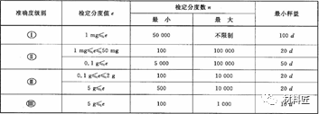 表一 Ⅱ、Ⅲ和Ⅵ級天平,最小稱量e可以用d值取代