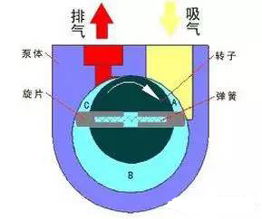 旋片泵的旋片把轉子、泵腔和兩個端蓋所圍成的月牙形空間分隔成A、B、C三部分,當轉子按箭頭方向旋轉時,與吸氣口相通的空間A的容積是逐漸增大的,正處于吸氣過程。而與排氣口相通的空間C的容積是逐漸縮小的,正處于排氣過程。居中的空間B的容積也是逐漸減小的,正處于壓縮過程。