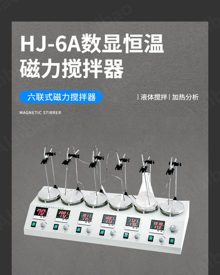 歐萊博HJ-6A數(shù)顯恒溫磁力攪拌器,攪拌功率40W*6RT-100數(shù)顯顯示溫度帶定時(shí)功能